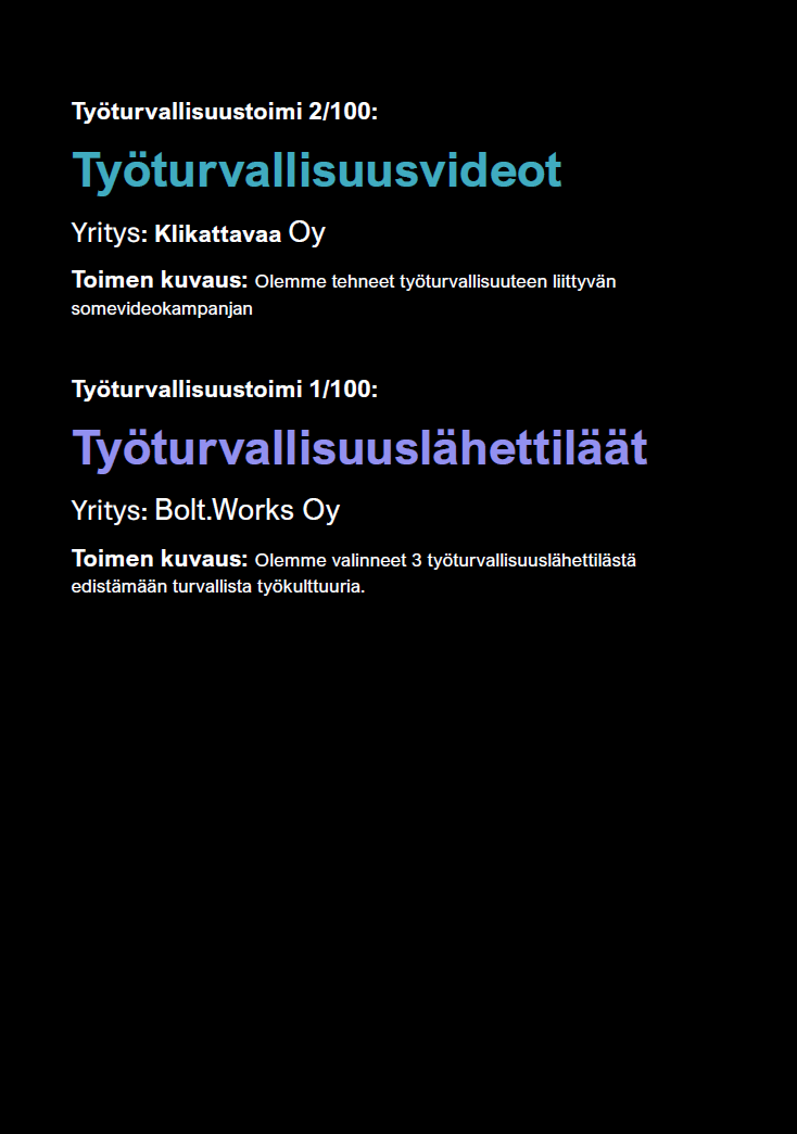 Haluamme käydä 1000 keskustelua työturvallisuudesta, toteuttaa 100 konkreettista parannusta ja rakentaa yhteistyötä 10 kumppanuusyrityksen kanssa.
