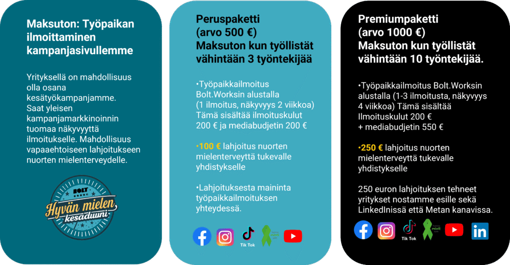 Kun työllistät vähintään 3 kesätyöntekijää, saat 500 euron arvoisen näkyvyyspaketin yrityksellesi, sisältäen 100 euron lahjoituksen Mieli Ry:lle Jos työllistät 10 tai enemmän, tarjoamme 1000 euron premium-paketin veloituksetta, sisältäen 250 euron lahjoituksen Mieli Ry:lle. Mikäli työntekijätarpeesi on pienempi, voit osallistua kampanjaamme myös täysin veloituksetta. Tällöin lahjoitussumma on myös vapaaehtoinen. Tule tekemään kanssamme hyvää ja tarjoamaan nuorille vastuullisia kesätyökokemuksia yrityksessäsi.