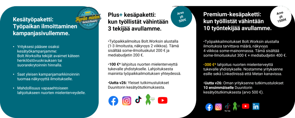 Kun työllistät vähintään 3 kesätyöntekijää, saat 500 euron arvoisen näkyvyyspaketin yrityksellesi, sisältäen 100 euron lahjoituksen Mieli Ry:lle Jos työllistät 10 tai enemmän, tarjoamme arvoltaan yli 1500 euron premium-paketin veloituksetta, sisältäen 300 euron lahjoituksen Mieli Ry:lle. Mikäli työntekijätarpeesi on 1-2 henkilöä, kesätyöpakettimme varmistaa työpaikkailmoituksenne perusnäkyvyyden omilla sivuillamme ja Duunitorin alustalla. Tällöin lahjoitussumma on myös vapaaehtoinen. Tule tekemään kanssamme hyvää ja tarjoamaan nuorille vastuullisia kesätyökokemuksia yrityksessäsi.